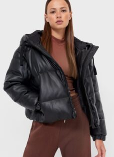 Geacă dama puffa din imitație de piele cu glugă Stradivarius