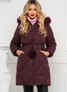Geaca dama Artista visinie din fas cu guler din blana ecologica cu cordon detasabil