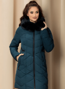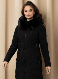 Geaca dama SunShine visinie din fas cambrata cu curea elastica si gluga cu blana ecologica