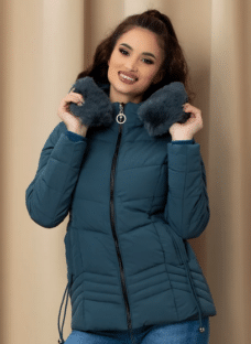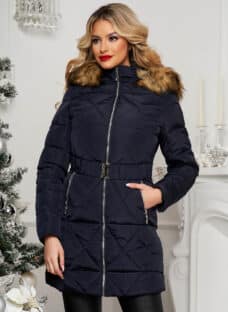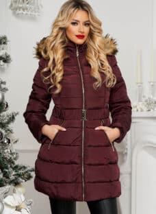 Geaca dama SunShine visinie cambrata din fas cu curea elastica si gluga cu blana ecologica detasabila