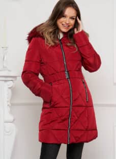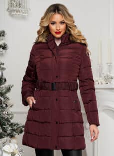 Geaca dama cambrata visinie din fas cu curea elastica si gluga detasabila