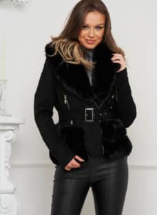Geaca dama neagra cambrata scurta din piele intoarsa cu guler din blana