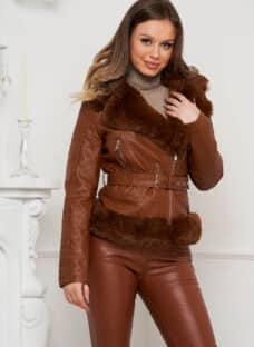 Geaca dama SunShine maro eleganta cambrata din piele si blana ecologica