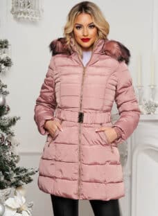 Geaca dama SunShine roz prafuit din fas cambrata cu curea elastica si gluga cu blana ecologica