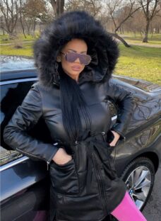 Geaca de Dama din Fas, cu Gluga si Blana, Croi Bomber, Neagra, Black Diva
