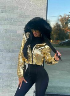 Geaca de Dama din Fas, cu Gluga, Croi Bomber, Aurie, Gold Diva