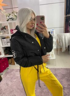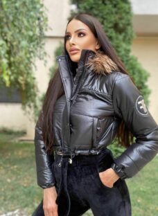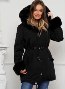 Geaca dama SunShine neagra cambrata din fas cu insertii de blana ecologica detasabile