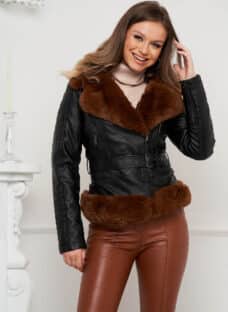 Geaca dama SunShine neagra eleganta cambrata din piele si blana ecologica