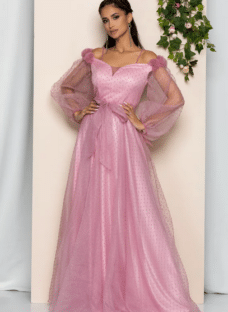 Rochie Ruth roz cu maneci tip clopot din plasa broadata