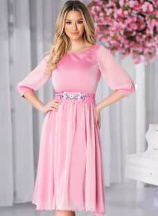 Rochie StarShinerS roz prafuit midi de ocazie in clos din material vaporos cu broderie florala